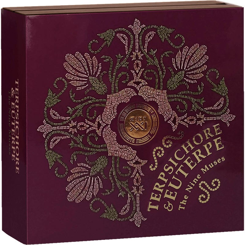 Серебряная монета весом в 2 унции из серии «Девять муз» от польского монетного двора MINT XXI. У нее качество античной отделки, высокий рельеф, выборочное золочение и селективная окраска. Поставляется в оригинальном футляре с сертификатом подлинности. Тираж: 500 штук.