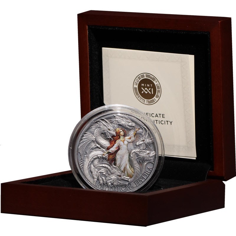 На реверсе изображена гидра с огненными глазами с девушкой, облаченной в эфирные одежды, которая олицетворяет торжество красоты над грозными невзгодами. Внизу надпись: MYTHICAL HYDRA.