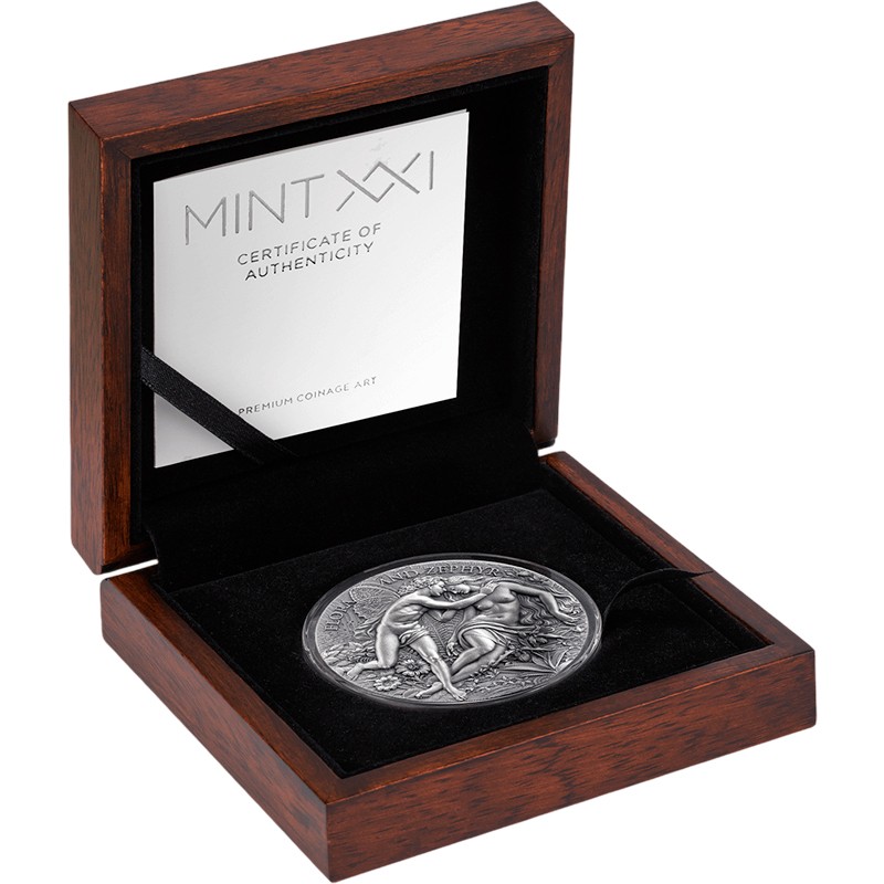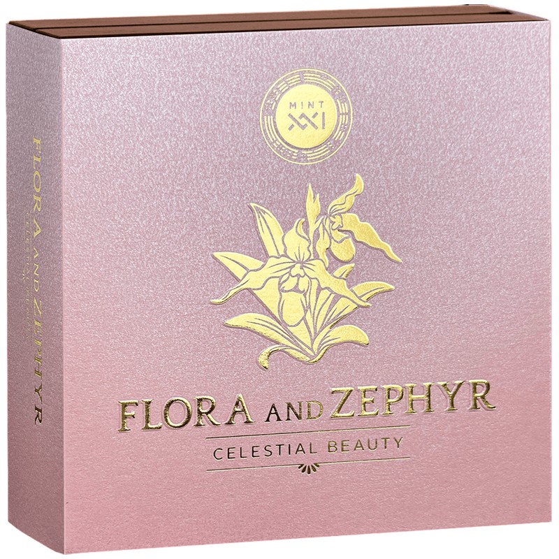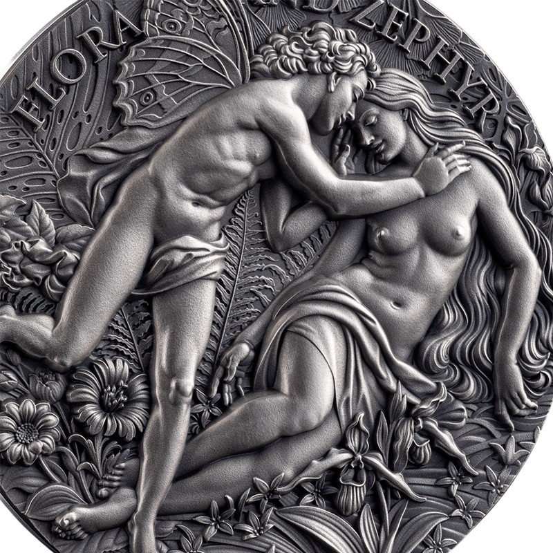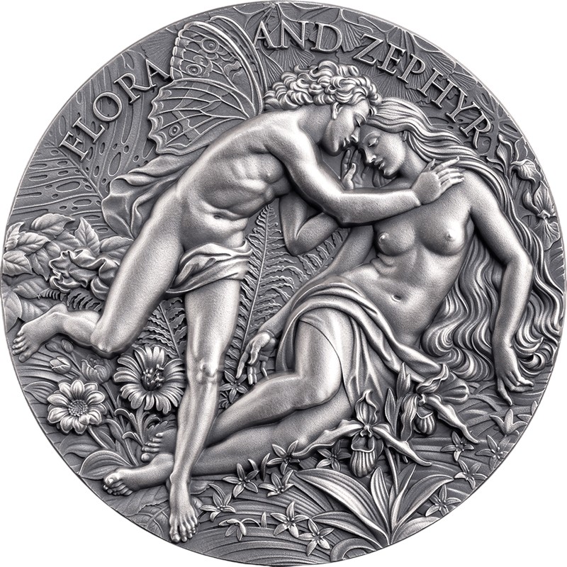 Эта уникальная 2 унцовая серебряная монета из серии «Небесная красота» создана по мотивам картины французского художника Уильяма-Адольфа Бугро «Флора и Зефир» 1875 года. Это одна из самых известных картин Музея изящных искусств в Мюлузе во Франции.