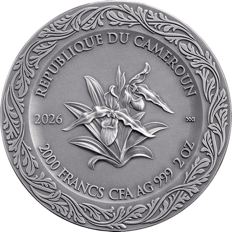 На аверсе в центре - цветок орхидеи. Вверху надпись: REPUBLIQUE DU CAMEROUN (страна-эмитент), внизу - 2000 FRANCS CFA  AG 999 2 OZ (номинал, вес и проба серебра), слева – 2026 (год чеканки). Вдоль канта по кругу - декоративный растительный орнамент.