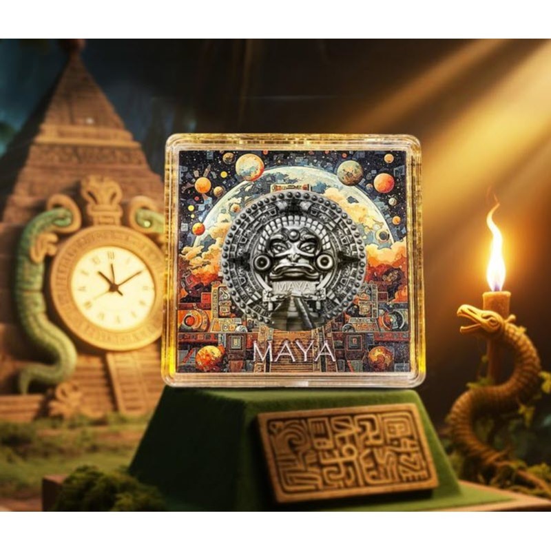На реверсе изображена маска майи на фоне глифов и пирамиды. Внизу маски надпись: MAYA.