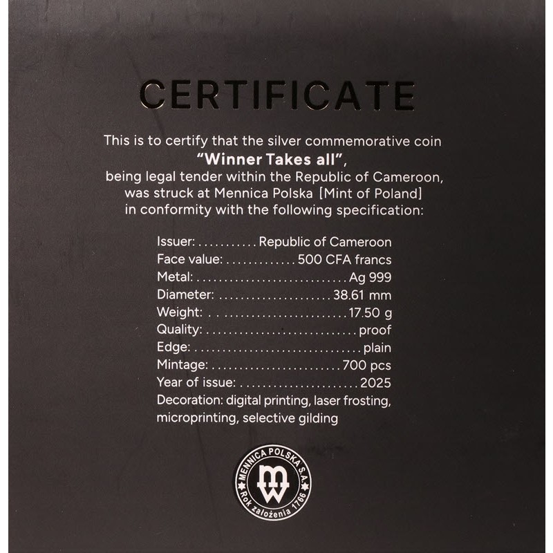 На реверсе изображен бык на фоне графиков и символов валют. Внизу надпись: WINNER TAKES ALL (Победитель получает все).