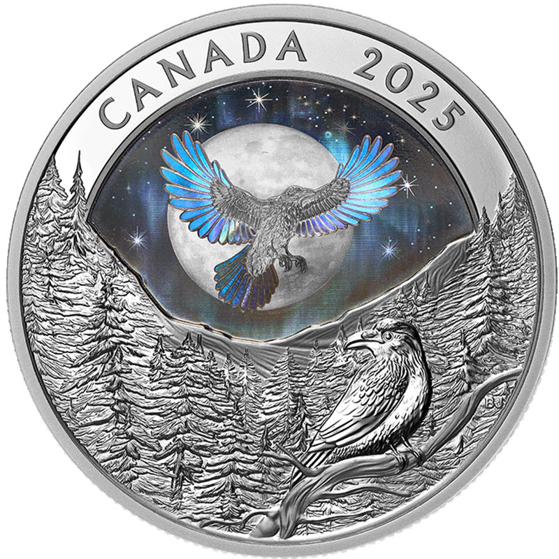 На реверсе изображен парящий ворон в лунном свете на фоне северного сияния. Внизу на ветке сидит созерцающий ворон. Вверху надпись: CANADA 2025 (страна-эмитент, год чеканки). Справа у канта инициалы дизайнера: ВJ (Bronson Jacque).