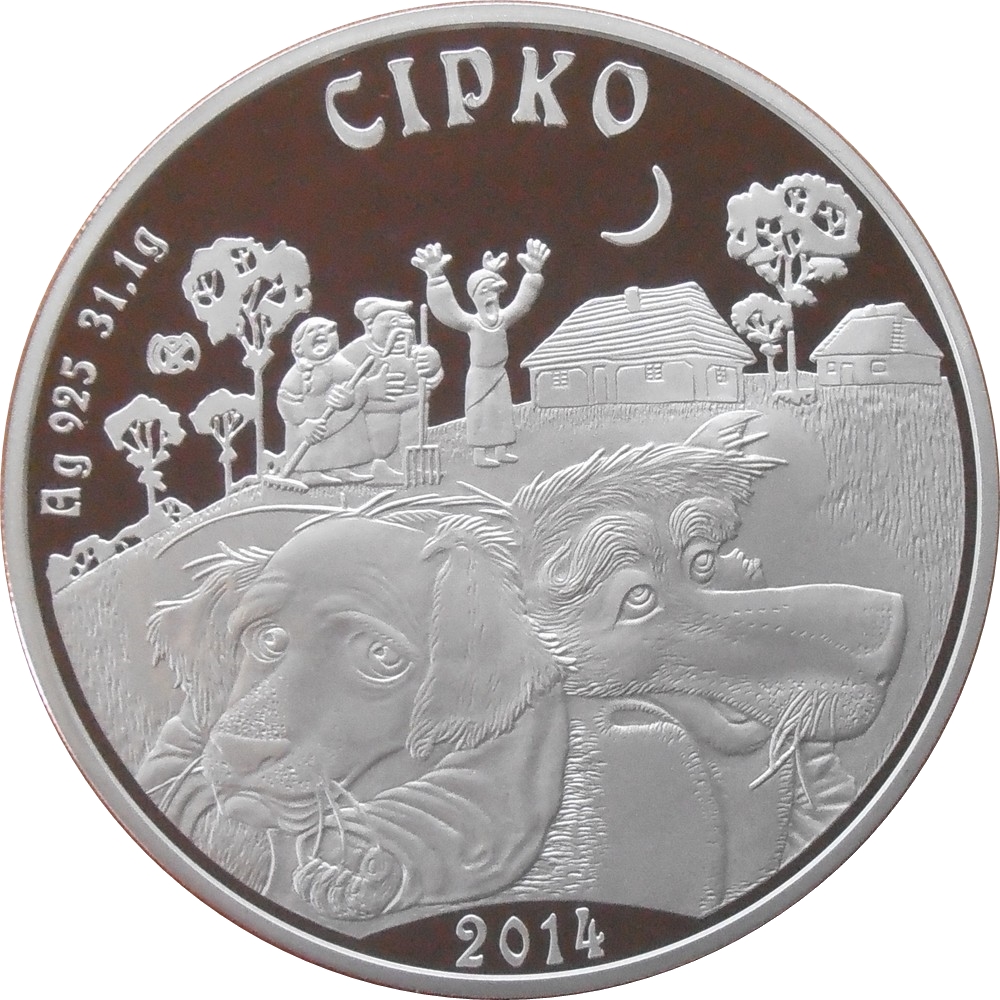 Персонажи украинской народной сказки «Сирко»; надпись СIРКО на украинском языке; год чеканки и товарный знак Монетного двора Казахстана; надпись Ag 925 31,1 г.