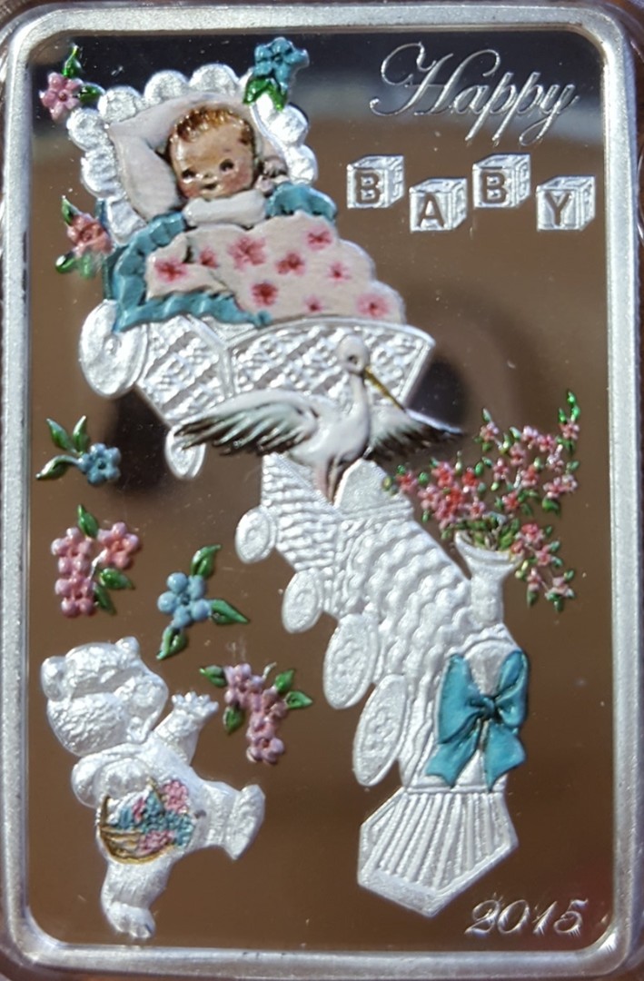 Младенец в колыбели, окруженный цветами и игрушками. Надпись — Happy BABY и год выпуска — 2015.