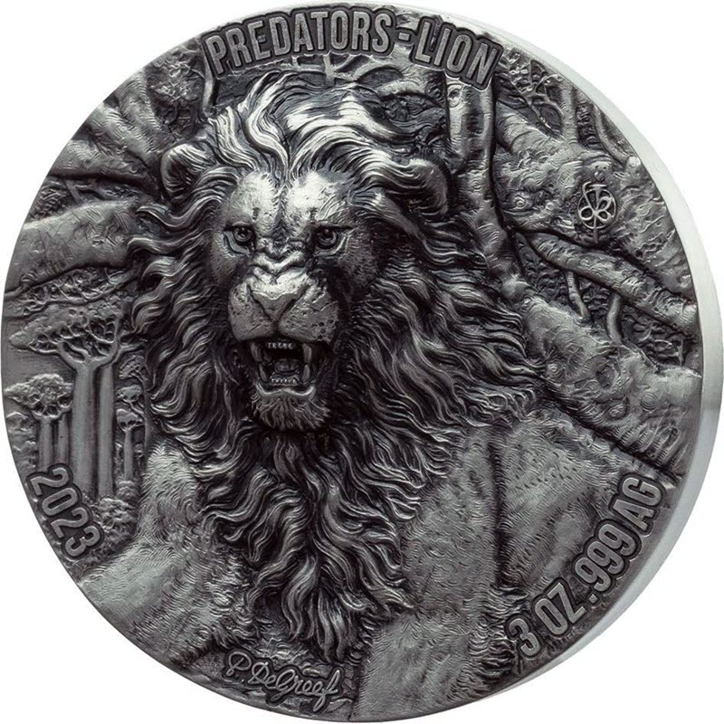 На реверсе изображена голова льва-самца с открытой пастью на фоне леса. Вверху вдоль канта надпись: PREDATORS-LION , внизу: 2023 P.DeGreef 3 OZ .999 AG (год чеканки, монограмма П. де Грефа, вес и проба серебра).