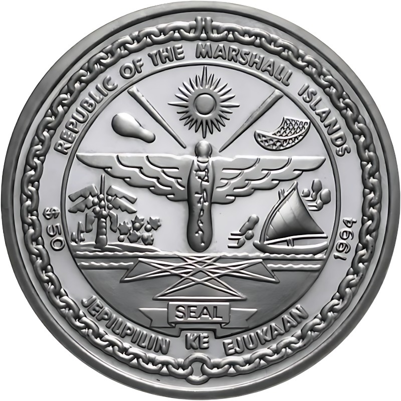 Вдоль круга расположены надписи: REPUBLIC OF THE MARSHALL ISLANDS $50 1994 JEPILPILIN KE EJUKAAN (страна-эмитент, номинал, год чеканки, Добиваться единства в действии). Вдоль канта орнамент в виде якорной цепи.