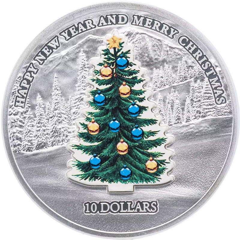 Цветная фигурка Ёлочки среди заснеженного пейзажа. Сверху название серии HAPPY NEW YEAR AND MERRY CHRISTMAS, внизу указан номинал монеты — 10 DOLLARS
