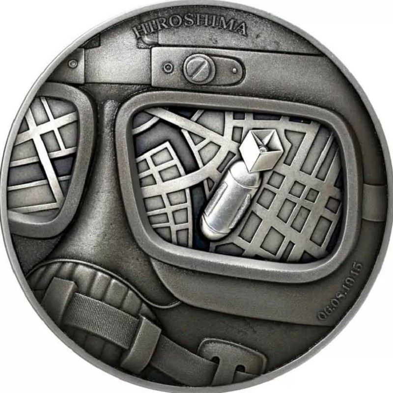 На реверсе монеты изображена маска пилота, отражающая сцену сброса бомбы на японский город. В дизайне также присутствует некоторое свечение в темных частях, намекая на представления людей о появлении радиоактивных веществ. Вверху надписи: "HIROSHIMA" - название монеты и "06.08.1945" - дата бомбардировки.