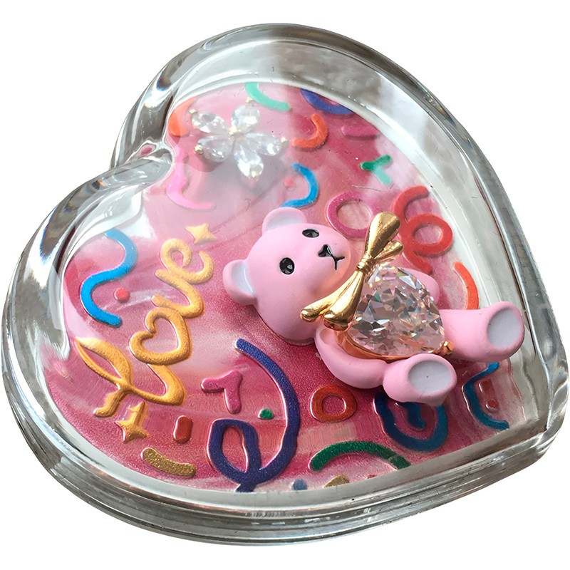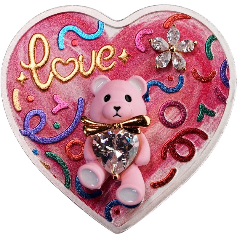 На реверсе изображен розовый мишка с золотым бантом, держащий большое хрустальное сердце. Вверху слева надпись love (любовь), выполнена золотыми курсивными буквами. Фон украшен ярко-розовым цветом и блестящими разноцветными завитками. Справа вверху - цветок с хрустальными лепестками.