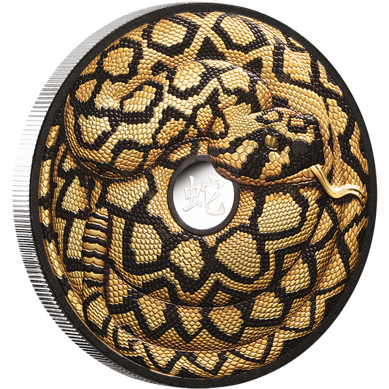 На реверсе изображена змея с выборочным золочением, обвившаяся вокруг китайского иероглифа: 蛇 (Змея).