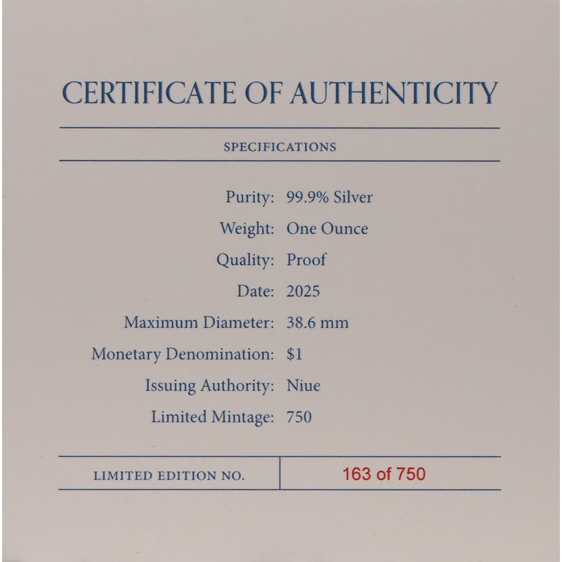 На аверсе изображен Его Величество король Чарльз III. На усечении шеи инициалы дизайнера JC (Jody Clark). Вдоль канта надпись: CHARLES III · NIUE 2025 · ONE DOLLAR · 1 oz 999 SILVER · (Чарльз III, страна-эмитент, год чеканки, номинал, вес и проба серебра).