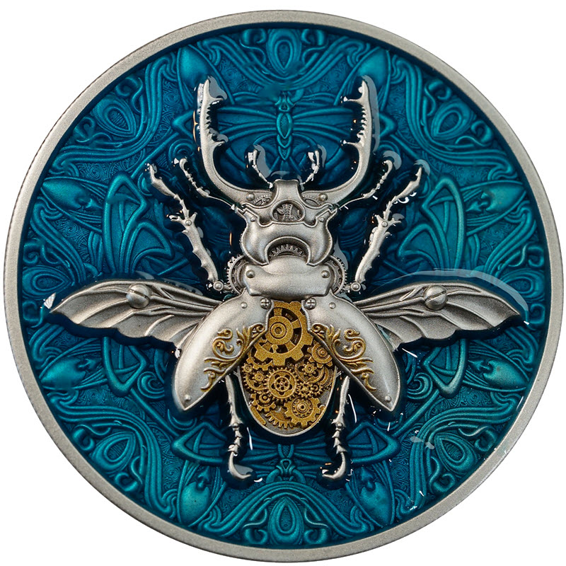 Эта невероятная серебряная монета весом в 2 унции посвящена жуку в стиле стимпанк. У нее античное качество, выборочное золочение и селективная окраска. Поставляется в футляре с сертификатом подлинности. Тираж: 199 штук.