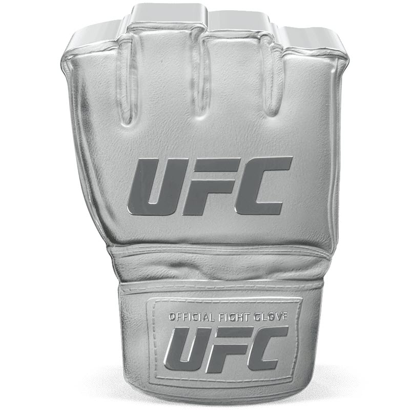 Эта потрясающая серебряная монета весом в 3 унции сделана в форме перчатки UFC. У нее размеры 40,6 х 55 мм и качество пруф. Поставляется в оригинальном футляре с сертификатом подлинности. Тираж: 1000 штук.