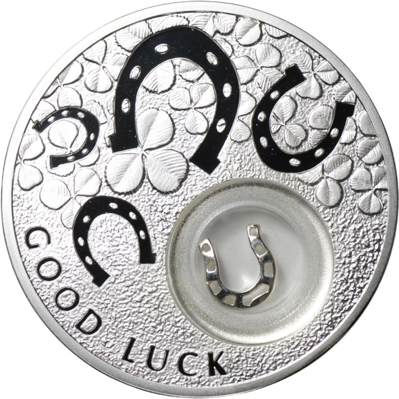 На реверсе изображены подковы и листья клевера, а также надпись «GOOD LUCK» (Удачи). Справа внизу - прозрачная капсула с подвижной миниатюрной серебряной подковой.