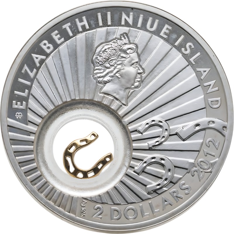 Главная особенность монеты — прозрачная капсула в левой нижней части, внутри которой находится подвижная миниатюрная серебряная подкова, позолоченная 24-каратным золотом. Рядом с капсулой изображения подков. На фоне расходящихся от капсулы лучей - портрет Ее Величества Королевы Елизаветы II. Вдоль канта надписи: m/w ELIZABETH II NIUE ISLAND 2012 2 DOLLARS Ag 925 (знак Польского монетного двора, Елизавета II, страна-эмитент, год чеканки, номинал, проба серебра).