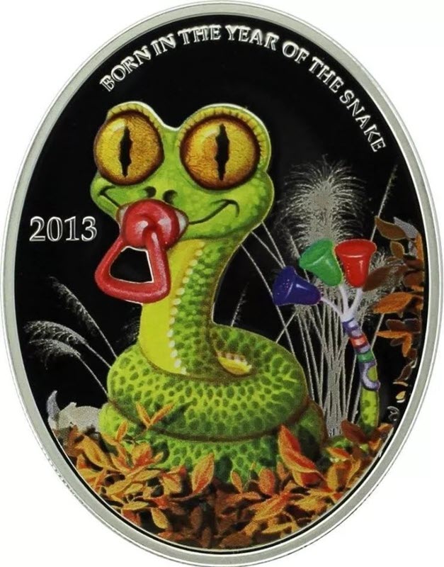 Серебряная монета "Рожденным в Год Змеи" посвящена символу 2013 года - Змее. У нее овальная форма размером 35.1 Х 45.1 мм и качество пруф. Тираж: 7000 штук.