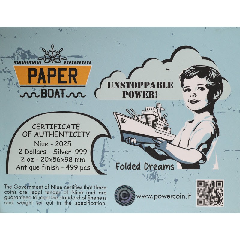 Эта чудесная серебряная монета в 2 унции из серии «Сложенные мечты» посвящена бумажной лодочке. У нее размеры 15 Х 54 Х 90 мм и качество античной отделки. Поставляется в оригинальном футляре с сертификатом подлинности. Тираж: 499 штук.