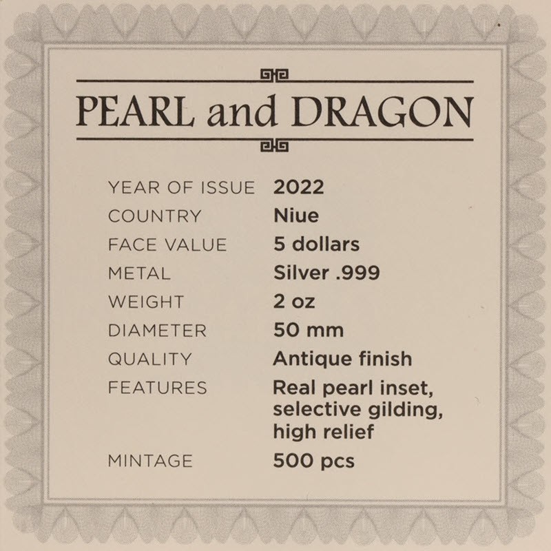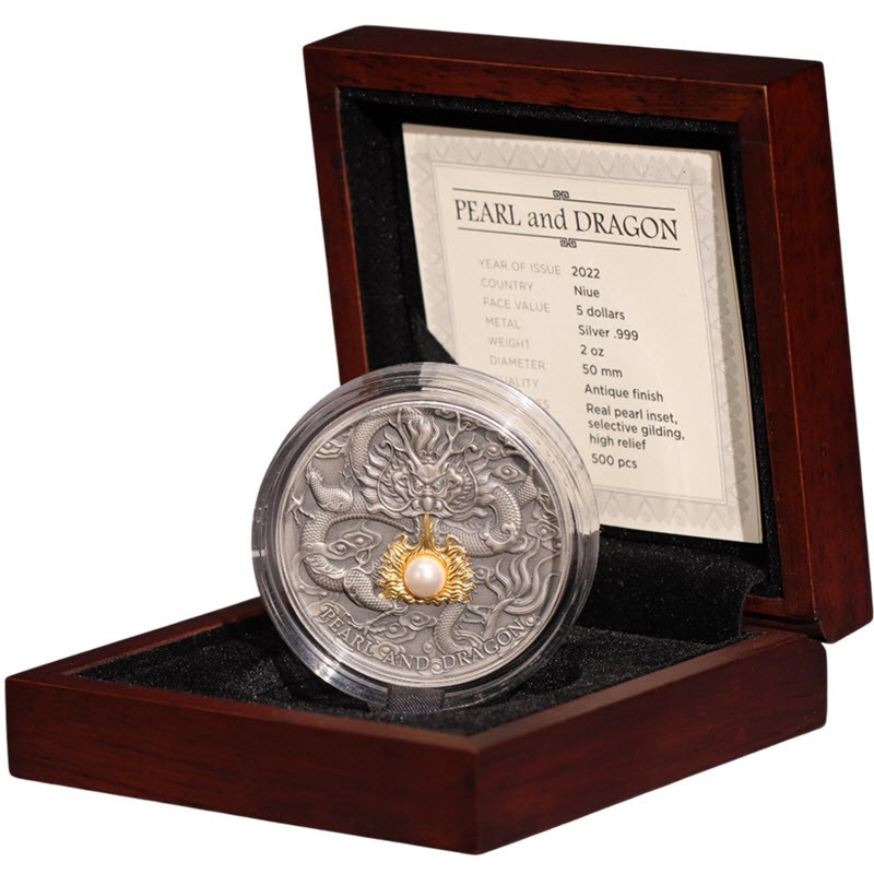 Эта невероятная серебряная монета весом 2 унции посвящена самому известному легендарному существу в китайской мифологии - дракону. Монета имеет античное качество отделки, невероятный рельеф, частично позолочена и украшена красивой вставкой из жемчуга. Монета поставляется в красивом футляре вместе с сертификатом подлинности. Ограниченный тираж 500 штук по всему миру!