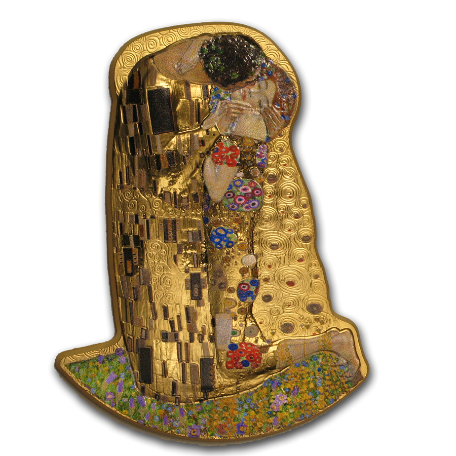 Фигурная серебряная монета, посвященная известной картине австрийского художника Густава Климта «Поцелуй».