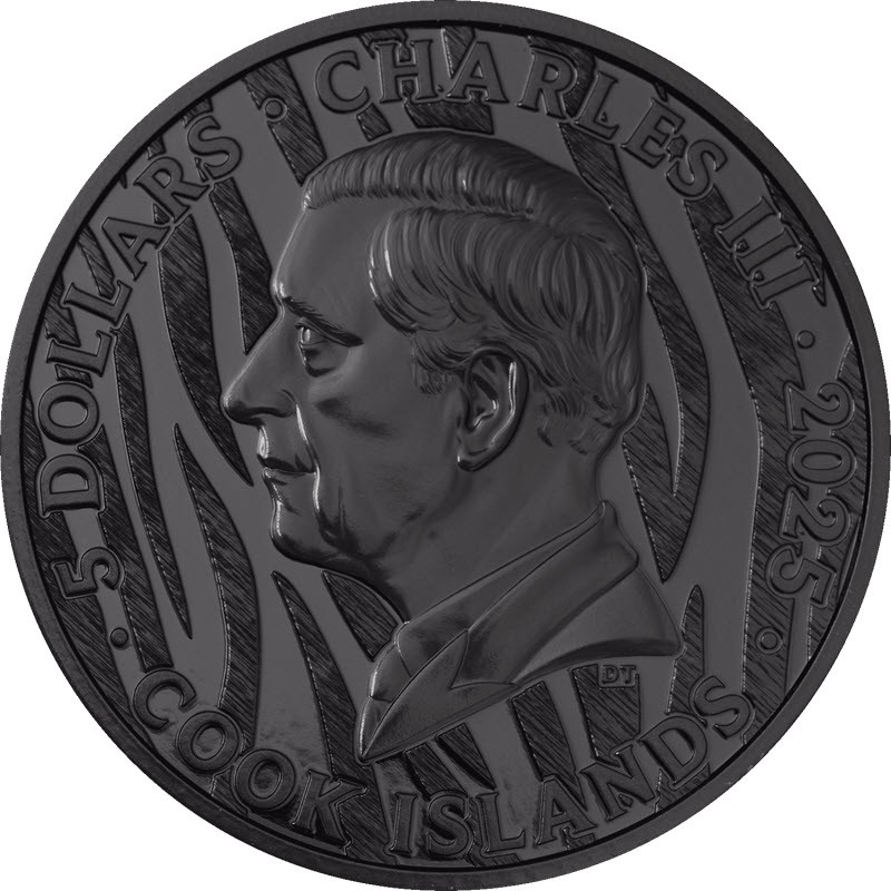 На аверсе изображен Его Величество король Чарльз III. Внизу портрета инициалы дизайнера TD (Dan Thorne). Вокруг портрета надпись: 5 DOLLARS · CHARLES III · 2025 · COOK ISLANDS · (номинал, Чарльз III, год чеканки, страна-эмитент).