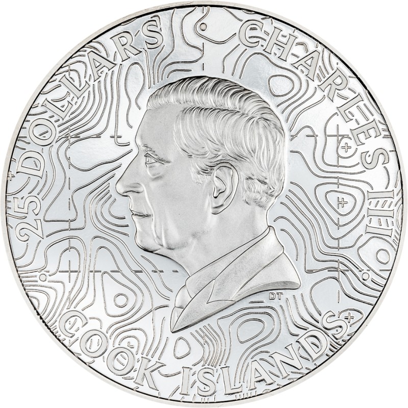 На аверсе изображение короля Карла III вместе с надписями: «25 DOLLARS» — номинал, «CHARLES III» — король и «COOK ISLANDS» — страна-эмитент.