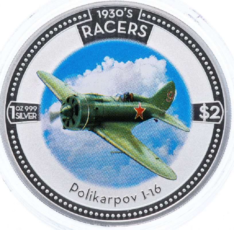 Серебряная монета Островов Кука "Воздушные гонки 1930-х - И-16" 2006 г.в., 31.1 г чистого серебра (Проба 0,999)