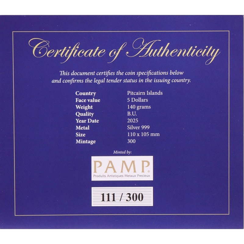 На аверсе изображено окно-розетка собора Саграда Фамилия. Слева внизу  надпись: Ag 999 · 140g Sagrada Familia Basilia Barcelona (вес и проба серебра, название собора). Справа внизу изображен герб Островов Питкэрн, вокруг него надпись: Charles III Pitcairn Islands FIVE DOLLARS 2025 (Чарльз III, страна-эмитент, номинал, год чеканки).