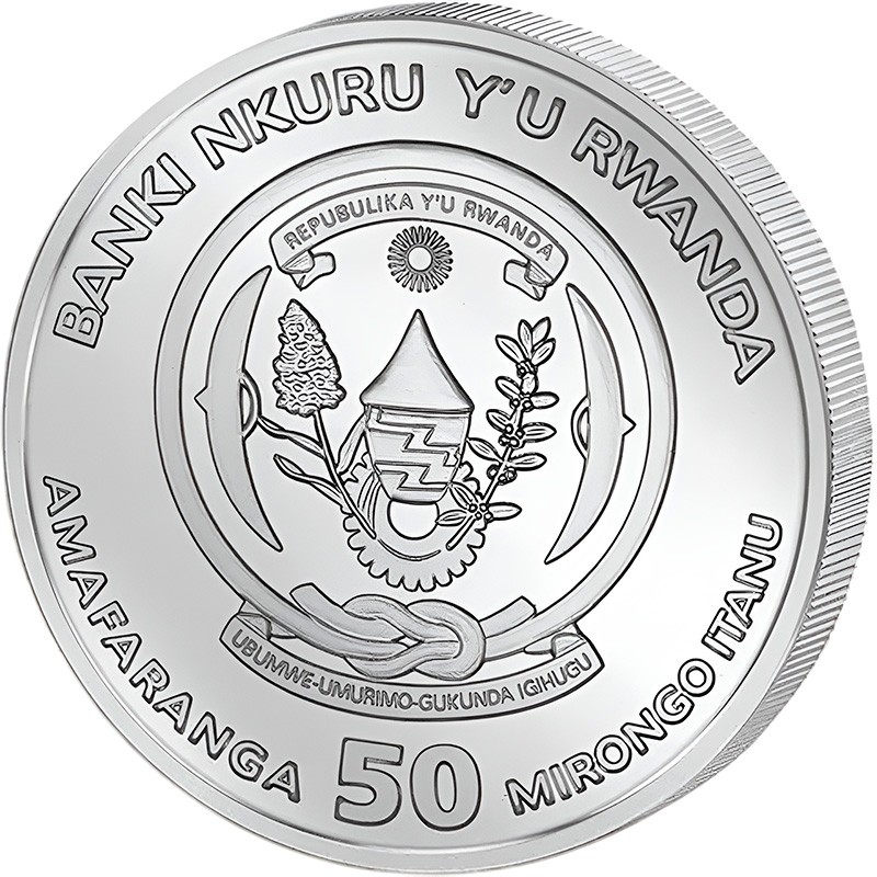 На аверсе в центре расположен герб республики Руанды. Надпись вверху: REPUBLIKA Y’U RWANDA (страна-эмитент), внизу – UBUMWE-UMURIMO-GUKUNDA-IGIHUGU (Единство, труд, героизм, патриотизм). По ободу полукругом надписи: BANKI NKURU Y'U RWANDA (Банк Руанды), внизу – AMAFARANGA, MIRONGO ITANU 50 (номинал).