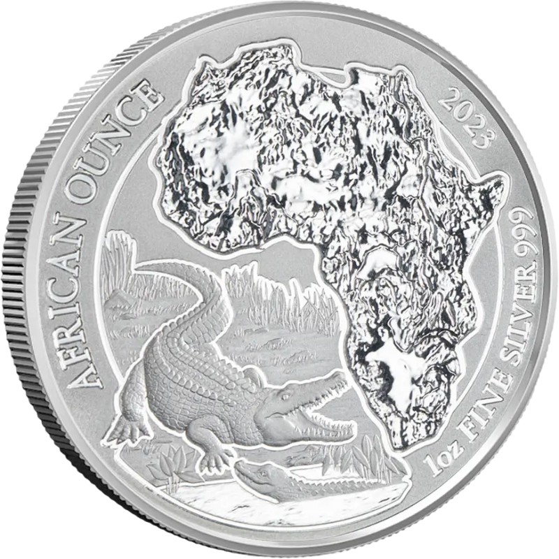 Внизу слева - изображение двух нильских крокодилов в естественной среде обитания у реки. Над ним расположен топографический контур Африканского континента.  Вдоль канта по кругу надписи: AFRICAN OUNCE 2023 1oz FINE SILVER 999 (Африканская унция, год чеканки, вес и проба серебра).