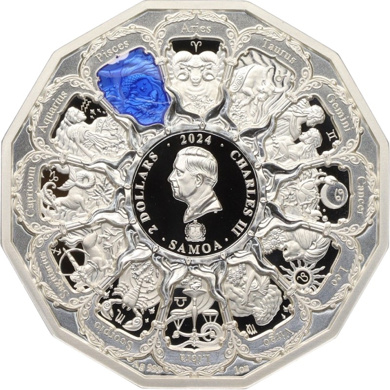 На реверсе монеты изображена круговая композиция из 12 знаков зодиака, каждый из которых заключен в отдельный орнаментальный медальон с соответствующим символом и изображением, а также названием на латинском языке. Знак зодиака Рыбы выделен цветной полупрозрачной эмалью, потому что архангел покровительствует этому знаку зодиака. В центре расположен портрет Его Величества Карла III, дизайнера Глина Дэвиса (GD). Под ним - герб Самоа. Вокруг портрета по кругу надписи: SAMOA ∙ 2 DOLLARS ∙ 2024 ∙ CHARLES III (страна-эмитент, номинал, год чеканки, Чарльз III). Внизу вдоль канта: Ag 999 1 oz (проба и вес серебра)