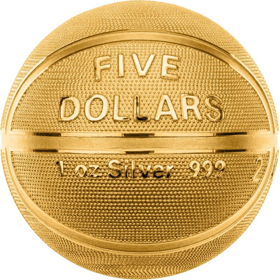 Серебряная монета сферической формы с покрытием золотом. Монета выполнена в форме мяча для баскетбола.