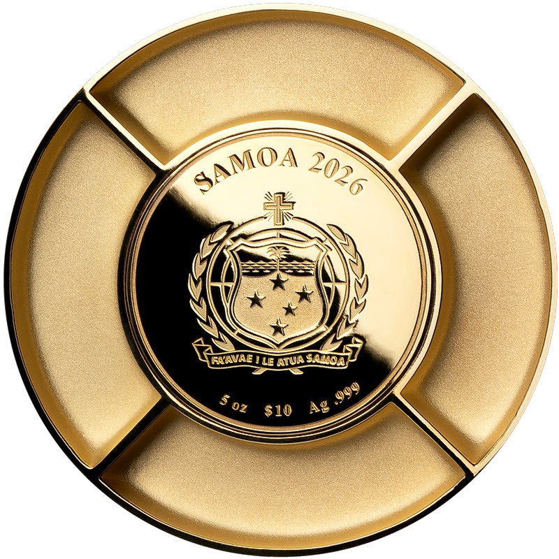 На аверсе изображен герб Самоа. Вокруг герба надпись: SAMOA 2026 5 oz 10 DOLLARS Ag .999 (страна-эмитент, вес и проба серебра, номинал).