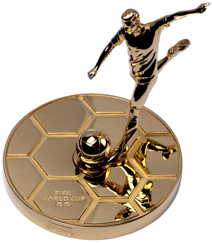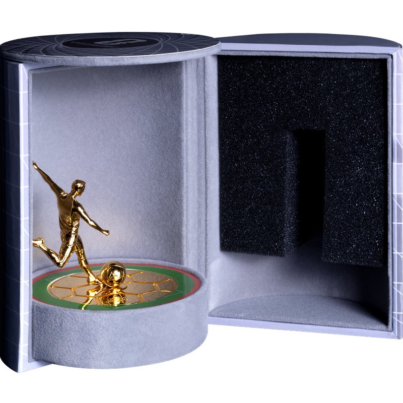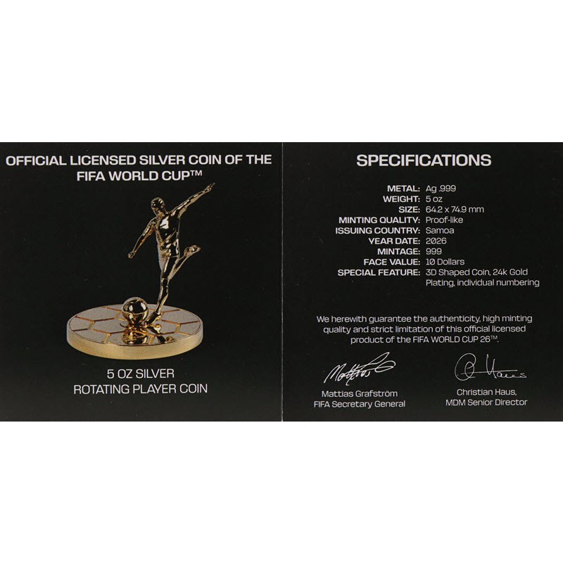 Эта потрясающая серебряная монета посвящена Чемпионату мира по футболу 2026 года. У неё качество пруф-лайк, 3D-форма размером 64,2 Х 74,9 мм и золочение в 24 карата. Монета оснащена инновационным вращающимся механизмом, который позволяет объемной фигуре футболиста вращаться на 360° вокруг своей оси. Поставляется в оригинальном футляре с сертификатом подлинности. Тираж: 999 штук.