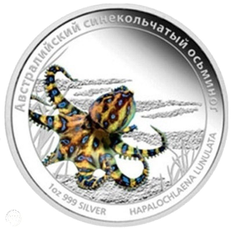 Цветное изображение синекольчатого осьминога на морском рифе. Название монеты на русском языке — Австралийский синекольчатый осьминог, название осьминого на латыне — YAPALOCHLAENA LUNULATA, вес и чистота металла — 1oz 999 SILVER