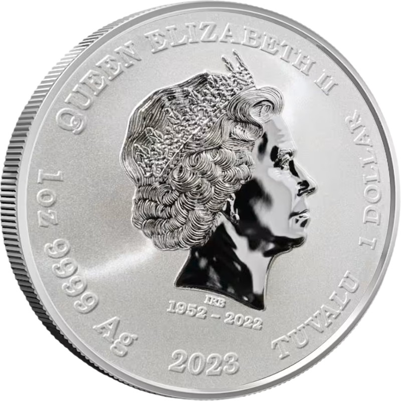 В центре монеты изображен портрет Её Величества Королевы Елизаветы II дизайнера Яна Рэнка-Бродли (IRB). Около портрета – 1952 - 2022 - годы правления. Вдоль канта по кругу надписи: QUEEN ELIZABETH II 1 DOLLAR TUVALU 1 oz 9999 Ag 2023 (Королева Елизавета II, номинал, страна-эмитент, вес и проба серебра, год чеканки).