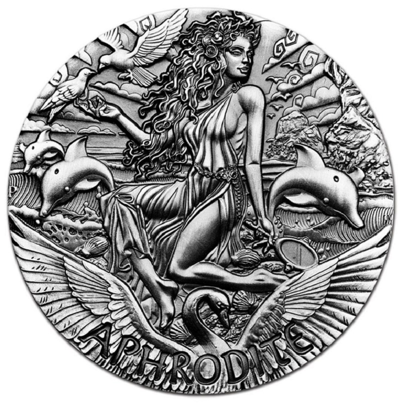 Монета из серии «Богини Олимпа» — впечатляющая монета без оправы с высоким рельефом и античной отделкой весом 2 унции, посвященная Афродите. Афродите почитали как богиню любви, наслаждения и красоты, возбуждающую страсть в сердцах богов и людей. Ограниченный тираж 2000 шт.