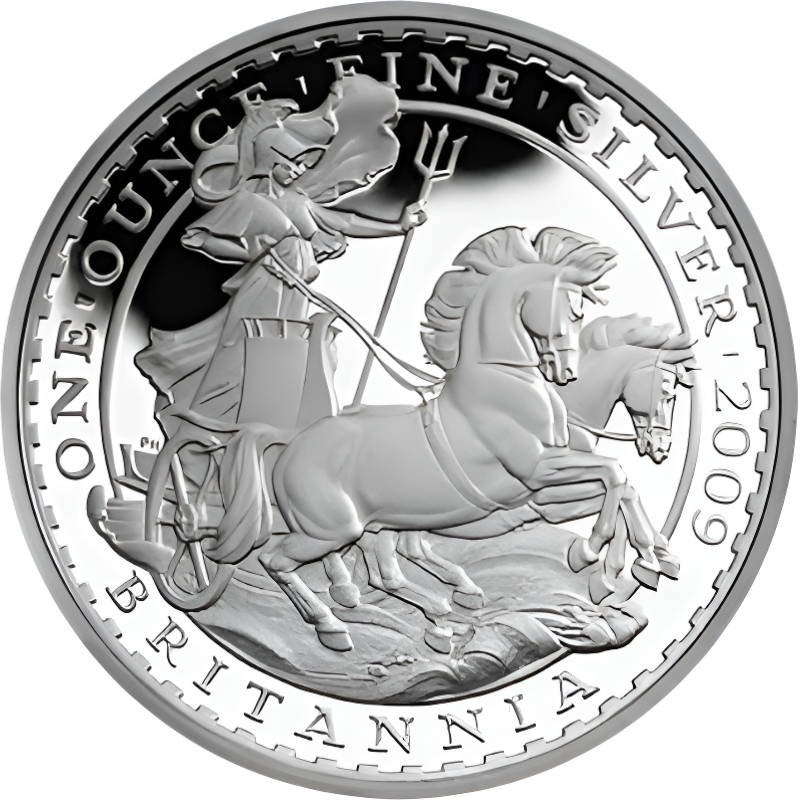 На реверсе монеты - фигура Британии, изображённая в виде воина на колеснице, запряжённой двумя конями, держащая трезубец в одной руке и вожжи в другой. Вокруг изображения надписи: ONE · OUNCE · FINE · SILVER · 2009 · BRITANNIA ( вес и проба серебра, год чеканки, страна-эмитент). Слева инициалы дизайнера PN (Philip Nathan).