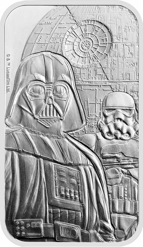 Серебряный слиток Великобритании из серии "Звездные войны" весом в 1 унцию 2024 года посвящен Темной стороне. У него размер 49.96 Х 28.98 Х 2.2 мм качества BU. Поставляется в блистере. Тираж: 70000 штук.