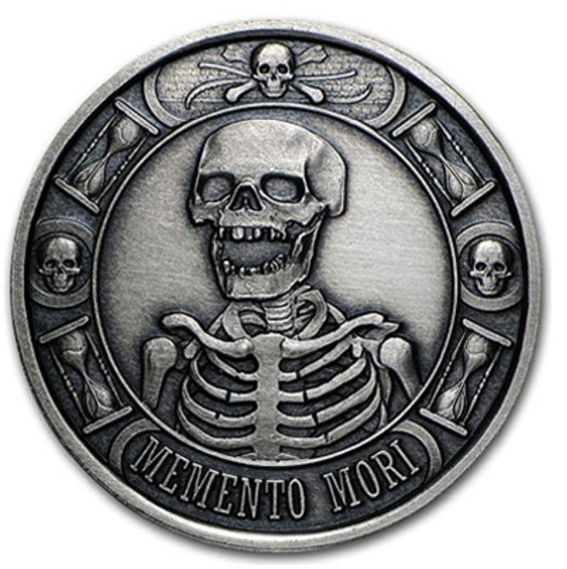 Аверс: изображение смеющегося скелета в окружении черепов и песочных часов. Надпись «MOMENTO MORI»