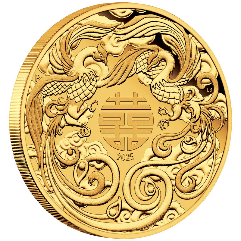 На реверсе в центре изображен символ двойного счастья: 囍 , под ним: 2025 (год чеканки). Вокруг символа два влюбленных Феникса на фоне стилизованных облаков. Слева монограмма Пертского монетного двора Р, справа инициалы дизайнера Лукаса Боуэрса (LB, Lucas Bowers).
