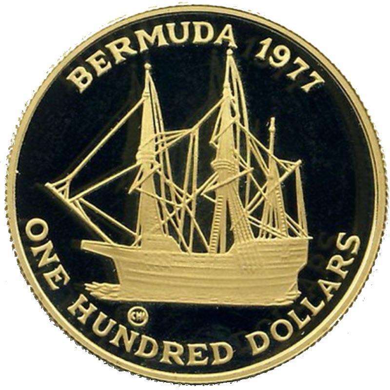 На реверсе изображен британский корабль «Deliverance», который был построен первыми колонистами, потерпевшими кораблекрушение у бермудских островов, для того, чтобы отправиться за провиантом в Вирджинию (США) в 1610 году. Внизу указан номинал монеты: «ONE HUNDRED DOLLARS» (100 долларов), а вверху – страна-эмитент («BERMUDA») и год выпуска («1977»).