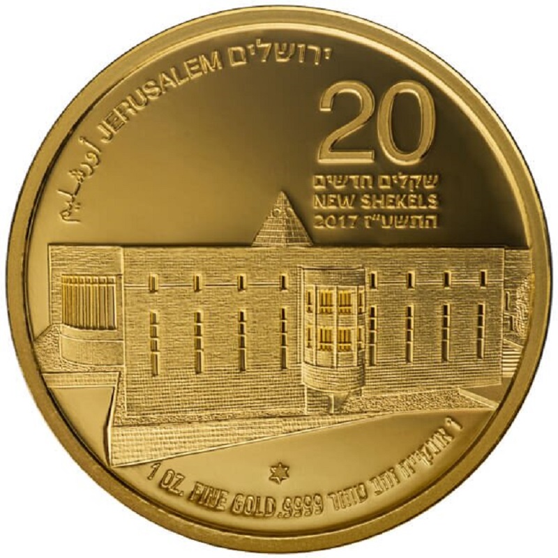 Здание Верховного Суда Израиля. В верхней части находится надпись «Иерусалим» на английском языке, на иврите и арабском языке, вверху справа - номинал «20 новых шекелей» и год монетного двора на иврите и английском языке. Ниже - знак монетного двора Звезды Давида, а вокруг нижней границы - чистота и вес металла: «1 унция. чистое золото .9999 »на иврите и английском.