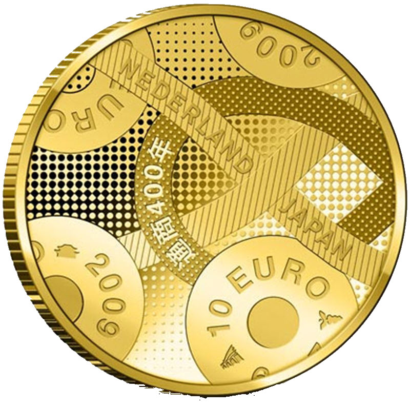 Золотая памятная монета Нидерландов "400 лет дипломатических отношений Нидерландов и Японии" 2009 года выпуска.