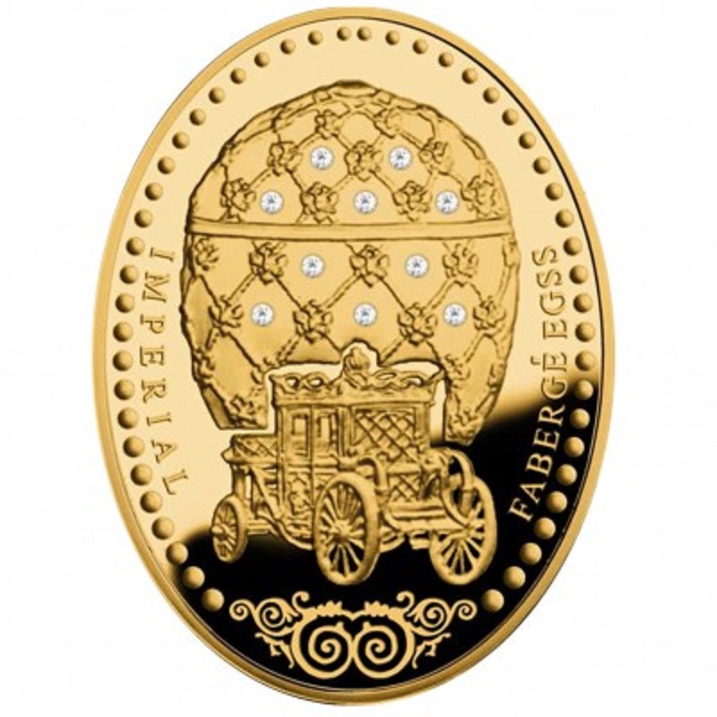 На реверсе монеты изображено яйцо «Коронационное» – одно из самых знаменитых яиц ювелирной фирмы Карла Фаберже. Сюрпризом яйца является миниатюрная копия императорской кареты, которая использовалась в церемонии коронации Николая II (изображена на переднем плане реверса). Изображение яйца украшено десятью вставками бриллиантов общей массой 0.16 г.
