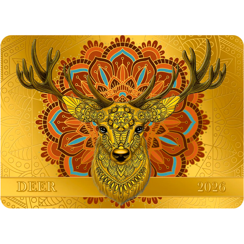 На реверсе изображен олень в ярком стиле мандалы. Слева внизу надпись – DEER (олень), справа – 2026 (год чеканки).