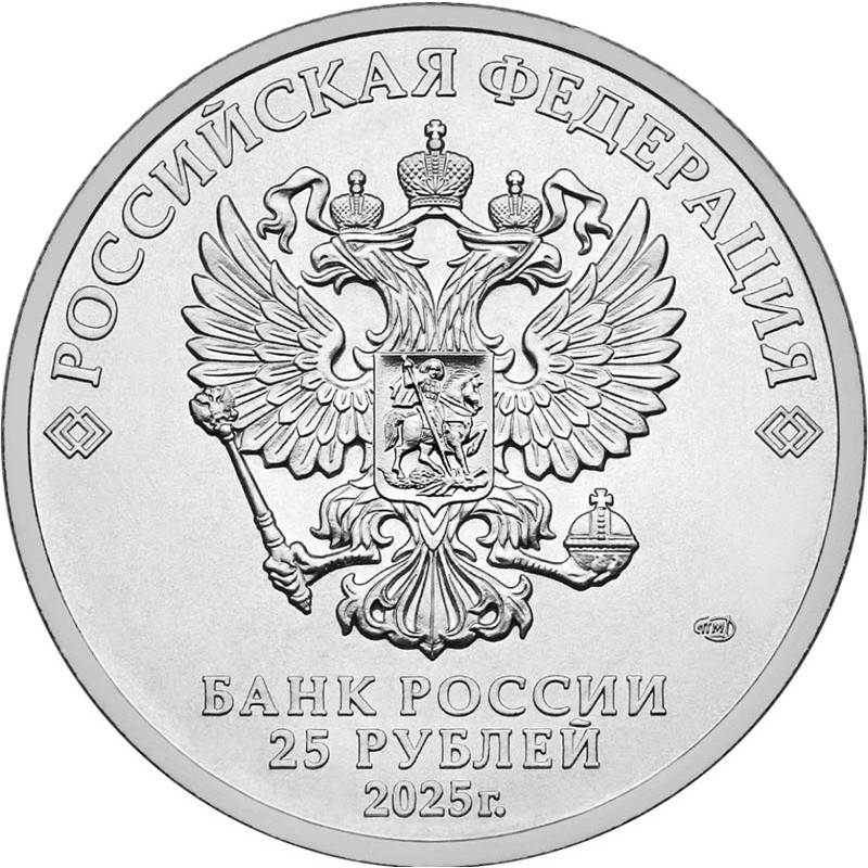 На аверсе рельефное изображение Государственного герба Российской Федерации. Вверху вдоль канта надпись: РОССИЙСКАЯ ФЕДЕРАЦИЯ, обрамленная с обеих сторон сдвоенными ромбами. Внизу под гербом справа: СПМД (товарный знак монетного двора), ниже надпись в три строки: БАНК РОССИИ 25 РУБЛЕЙ 2025 г. (банк, номинал, год чеканки).