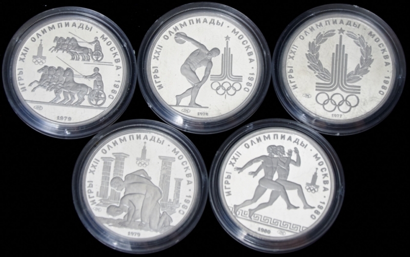 Набор из 5 платиновых монет, посвященных Олимпиаде 1980 года, номиналом 150 рублей.
