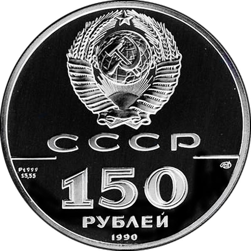 На аверсе изображен герб СССР с 15 витками ленты, под гербом надпись: СССР. Ниже слева и справа черта, под чертой слева Pt 999 15,55 (вес и проба платины), под чертой справа знак монетного двора ЛМД. Ниже надпись в три строки: 150 РУБЛЕЙ 1990 (номинал, год чеканки).