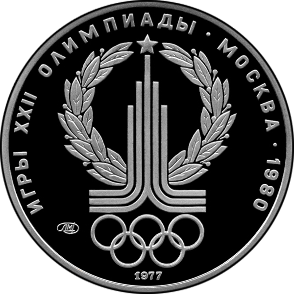 На реверсе слева и сверху вдоль канта слова «ИГРЫ XXII ОЛИМПИАДЫ», справа разделенные точкой слово «МОСКВА» и год проведения XXII Олимпиады «1980», в середине эмблема Московской Олимпиады, ниже слева монограмма монетного двора «ЛМД», внизу у канта по центру год выпуска монеты «1977».
